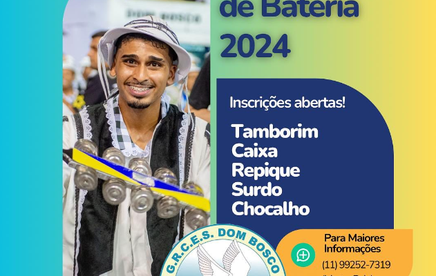 A escola de samba Dom Bosco de Itaquera anunciou através de suas redes sociais que abriu inscrições para a sua escolinha de Bateria.