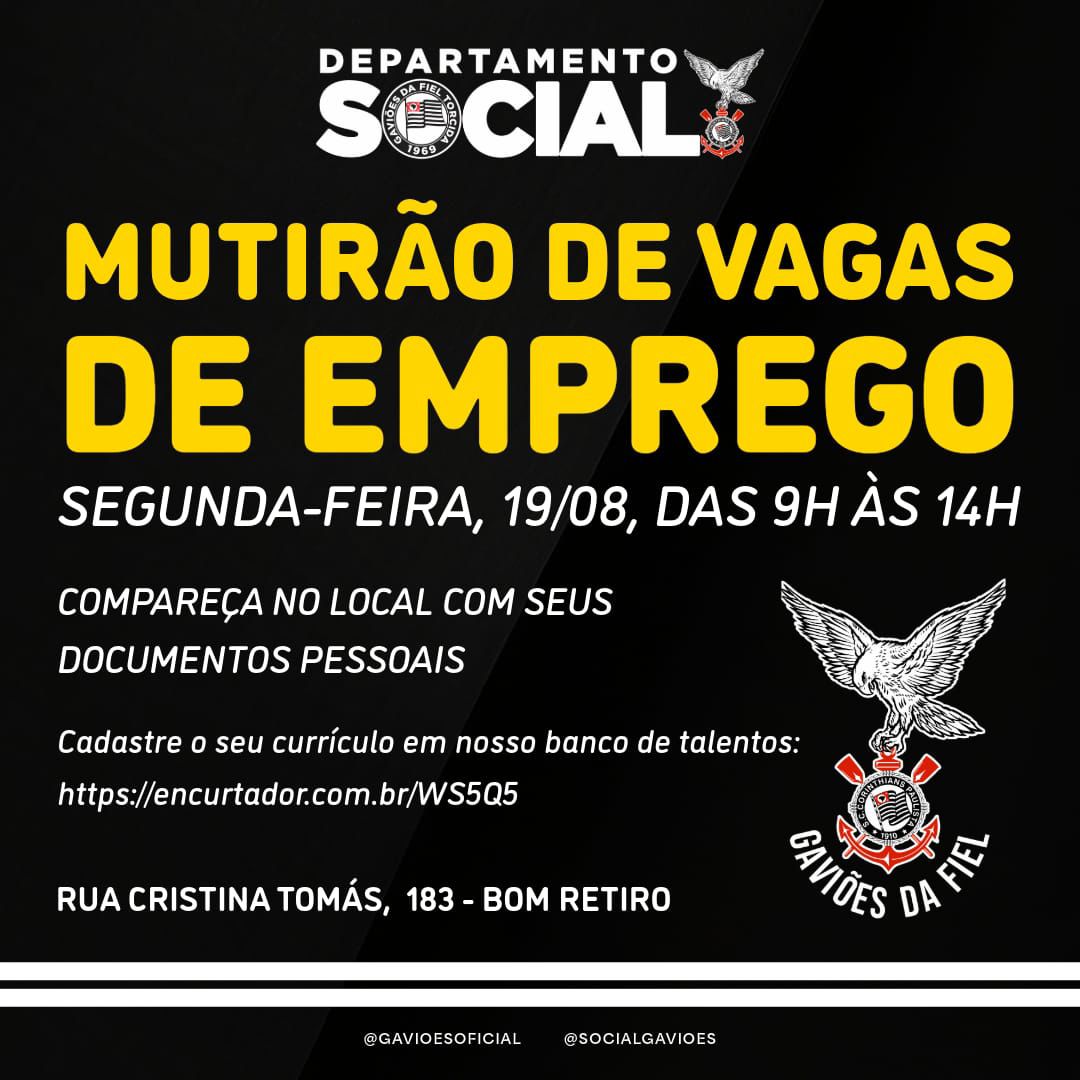 O departamento social da Gaviões da Fiel promoverá no próximo dia 19/08 um mutirão de vagas de emprego.