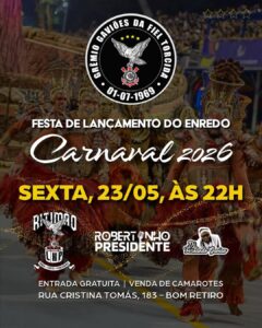 A Escola de Samba Gaviões da Fiel dará mais um importante passo rumo ao Carnaval 2026 com a realização da sua tradicional Festa de Lançamento do Enredo, marcada para a próxima sexta-feira, 23 de maio. O evento é um dos momentos mais aguardados por componentes, torcedores e amantes do samba, pois marca o início oficial do novo ciclo carnavalesco da agremiação.
